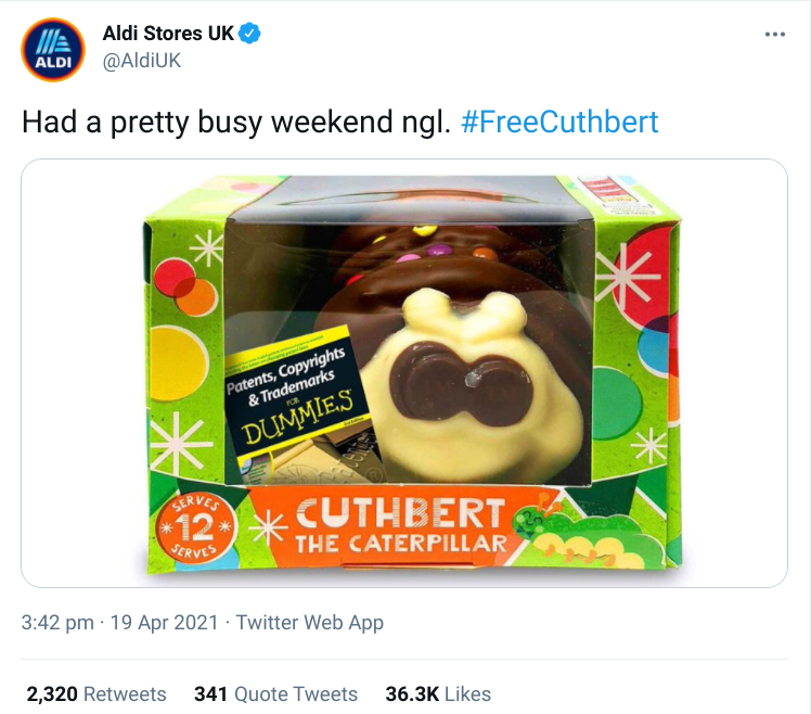 - Aldi: Colin the Caterpillar Cake Court Trial: In April 2021, Marks and Spencer’s launched legal action against Aldi over the likeness of Marks’ Colin the Caterpillar cake to Aldi’s Cuthbert the Caterpillar cake. Aldi’s social media team turned the legal battle into a humorous and engaging campaign, gaining significant attention from both the media and the public.