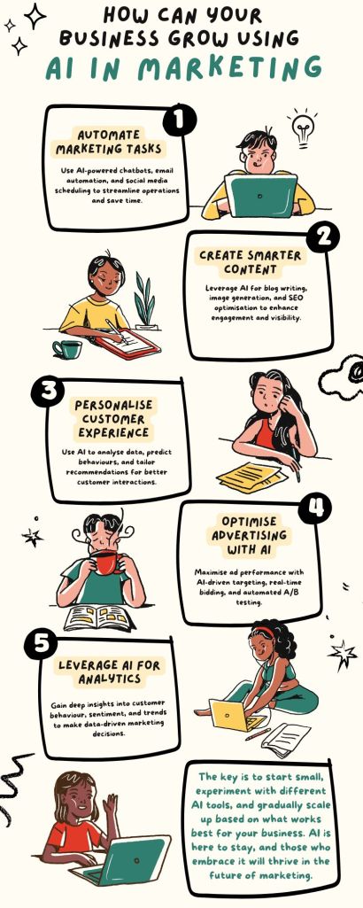 AI is no longer a luxury reserved for large corporations; small businesses can also harness its power to optimise marketing, personalise customer experiences, and drive growth. By integrating AI-powered tools into automation, content creation, customer insights, advertising, and analytics, small businesses can stay competitive in the ever-evolving digital landscape.